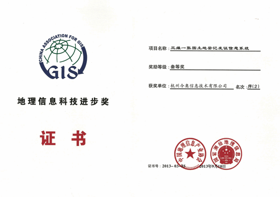 • 地信三維一張圖土地登記發證三等獎-公司
